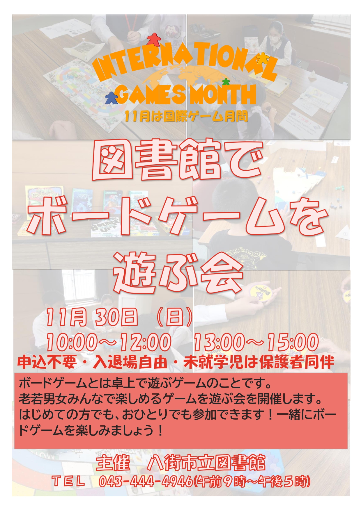 ボードゲームとは卓上で遊ぶゲームのことです。老若男女みんなで楽しめるゲームを遊ぶ会を開催します。はじめての方でも大丈夫!お気軽にご参加ください。※申込不要で入退場は自由です。また、未就学児は保護者同伴でお願いします。