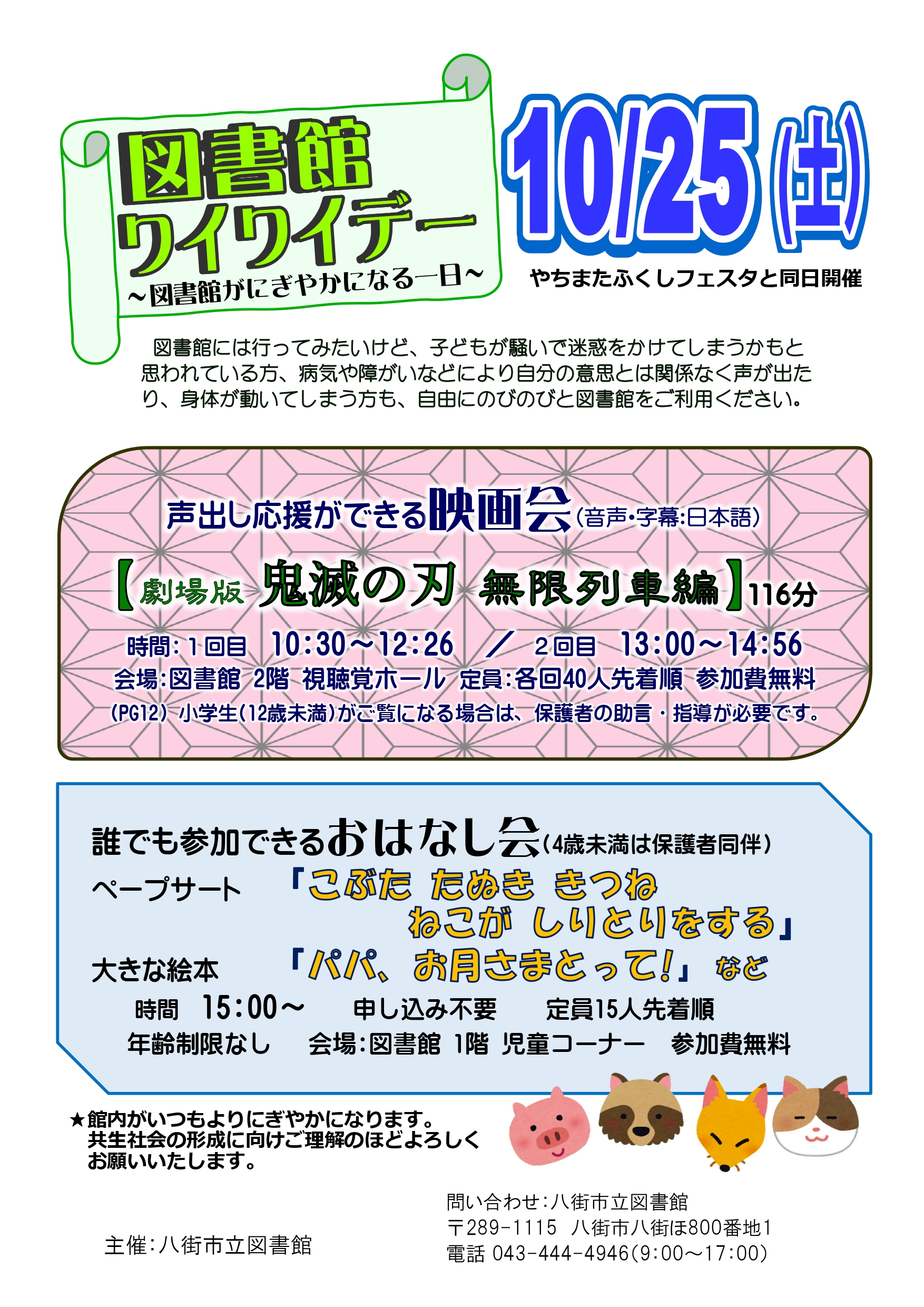 図書館には行ってみたいけど、子どもが騒いで迷惑をかけてしまうかもと思われている方、病気や障がいなどにより自分の意思とは関係なく声が出たり、身体が動いてしまう方も、自由にのびのびと図書館をご利用ください。※館内がいつもよりにぎやかになります。共生社会の形成に向けご理解のほどよろしくお願い申し上げます。