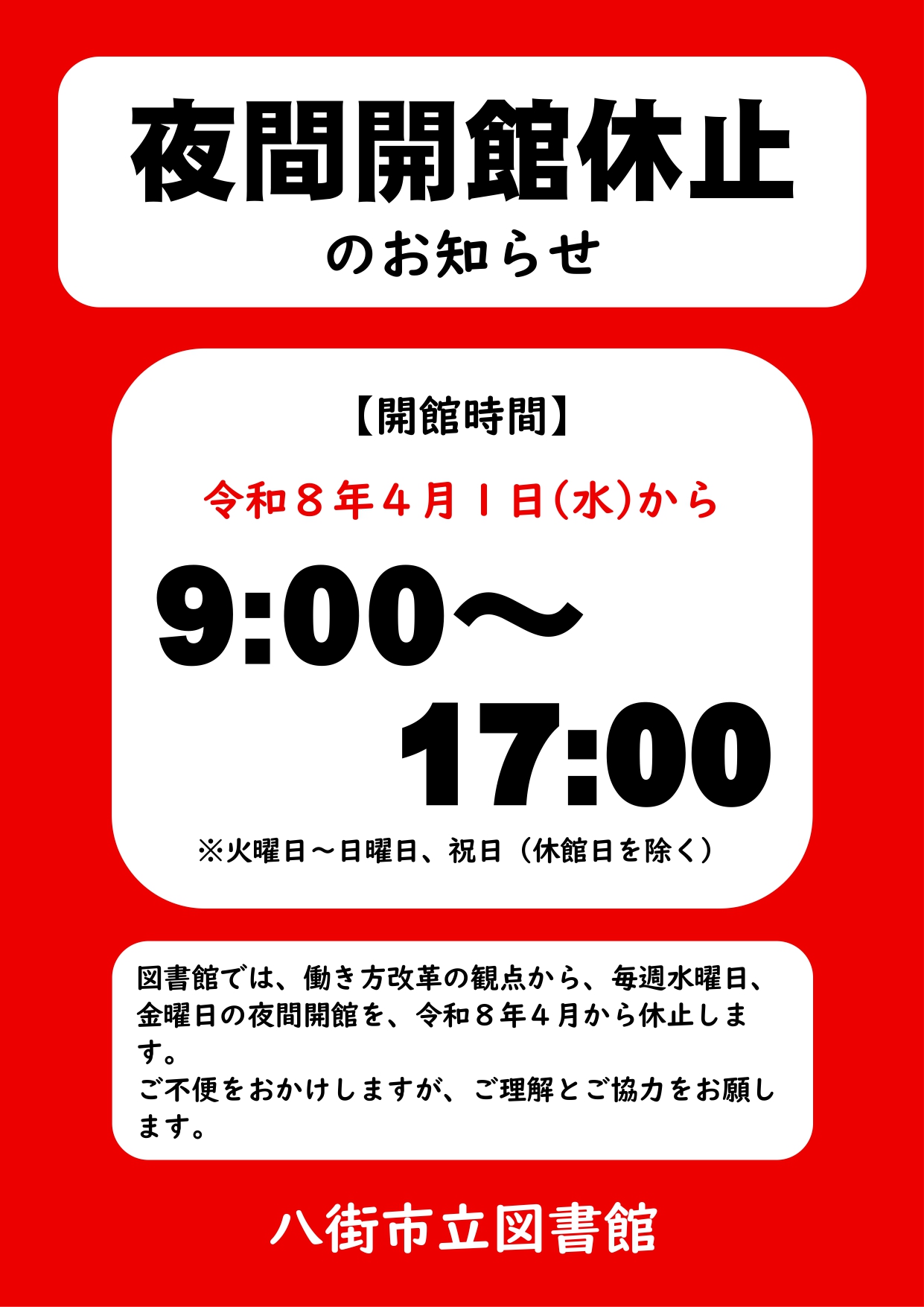 図書館では、働き方改革の観点から、毎週水曜日、金曜日の夜間開館を、令和8年4月から休止します。閉館後に本や雑誌を返却する場合は、ブックポストをご利用ください。また、CDやDVDなどブックポストに返却できないものは開館時間内にお持ちいただくか、移動図書館をご利用ください。詳しくは図書館までお問い合わせください。